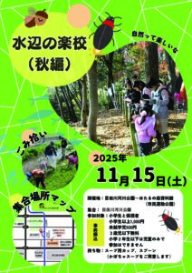 水辺の楽校(秋編)11月15日(土)開催します! 目田川モデル河川公園を出発し、ゴミ拾いをしながら市民運動公園へ! 市民運動公園で秋さがしウォークラリーをして、お楽しみをゲット! 申込はこちら ⇒ http […]