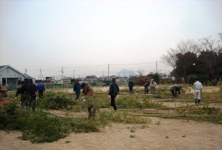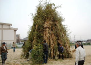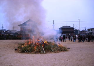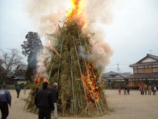 平成25年 1月13日(日) 午後4時点火 ![]() ![]() 自治会、伝統文化保存会 そして子ども会の共同作業、左義長祭が行われました。 前日の12日 子ども会が町内を廻り 古いお札(ふだ)や お正月の注連飾り(しめかざり)を回収します。その間自治会、 保存会の大人達は町内有志の方が提供してくれる 藁、竹を集め みんなで組立てます。 午後4時 点火!2日かかって作られた松明は大きな炎をあげて燃え上がります 10分ほどで組み立てた骨組みが倒れ 火の勢いはなくなりますが この後 燃え残りがないように燃やしつくして終了。 以前は燃え残りの火が翌日まで燻っていましたが今は火事など事故のないよう 自衛消防隊によって消火されます。 いつの頃からか、そのあとの直会(なおらい)に出される豚汁をよばれ、我々大人はお神酒もよばれて無事終了しました。 |